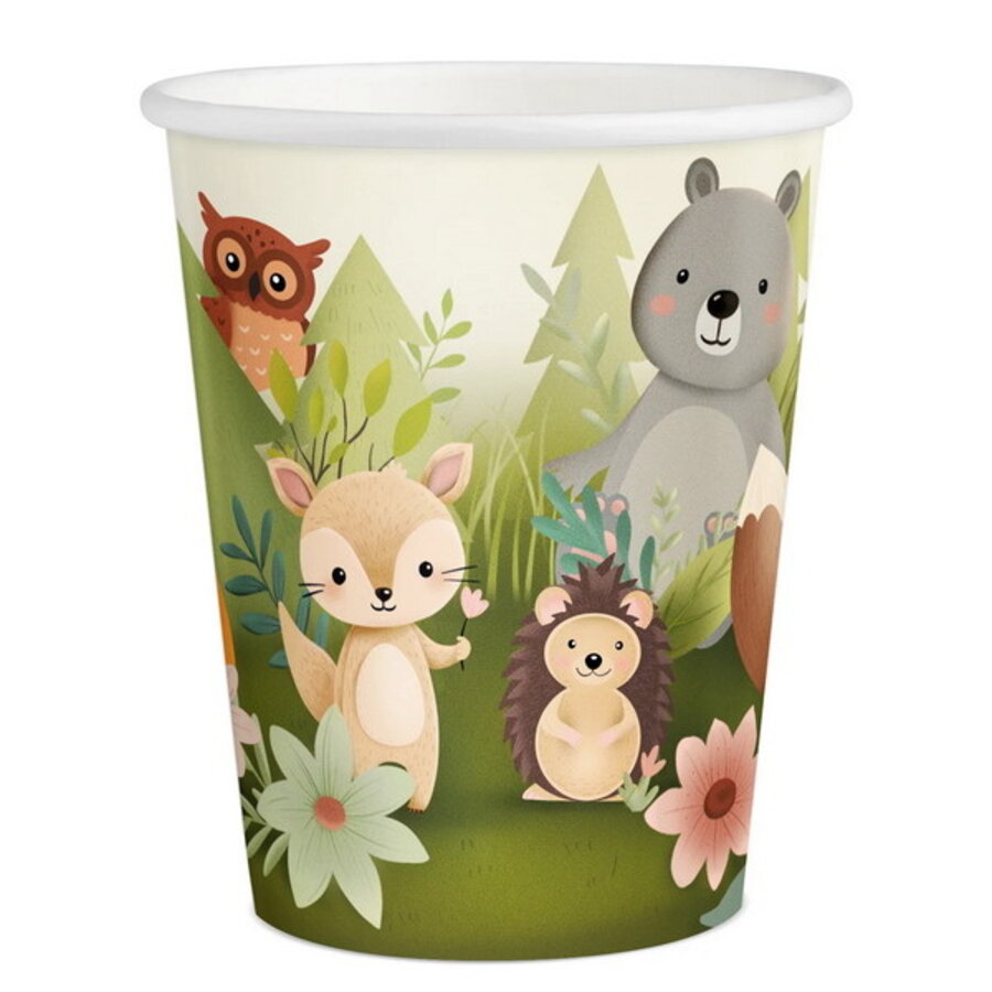 Een pakje met 6 kartonnen bekertjes bedrukt met bosdieren. Inhoud: 220ml.