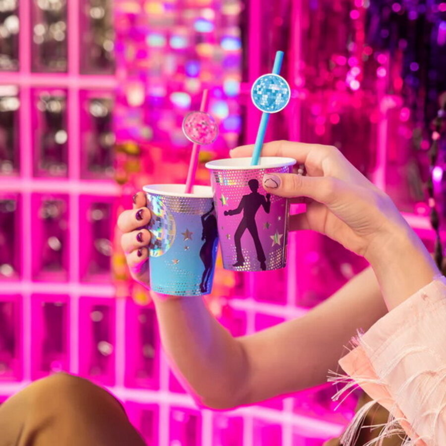 Een pakje met 6 prachtige gekleurde kartonnen bekertjes bedrukt in disco stijl.