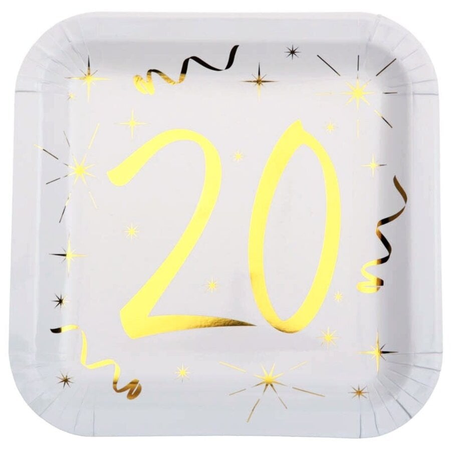 Tien stijlvolle kartonnen bordjes bedrukt in goudkleurige folie met het cijfer 20. Schitterende sfeervolle feestartikelen voor een 20 jaar verjaardag. Doorsnede: 23cm.