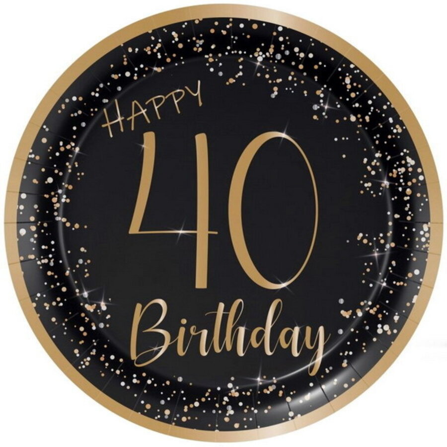 Acht feestelijke kartonnen bordjes bedrukt in goudkleurige letters met de tekst Happy 40 birthday. Ook verkrijgbaar in bekertjes en gebaksbordjes. Schitterende sfeervolle feestartikelen voor een 40 jaar verjaardag. Afmeting: 23cm x 23cm.