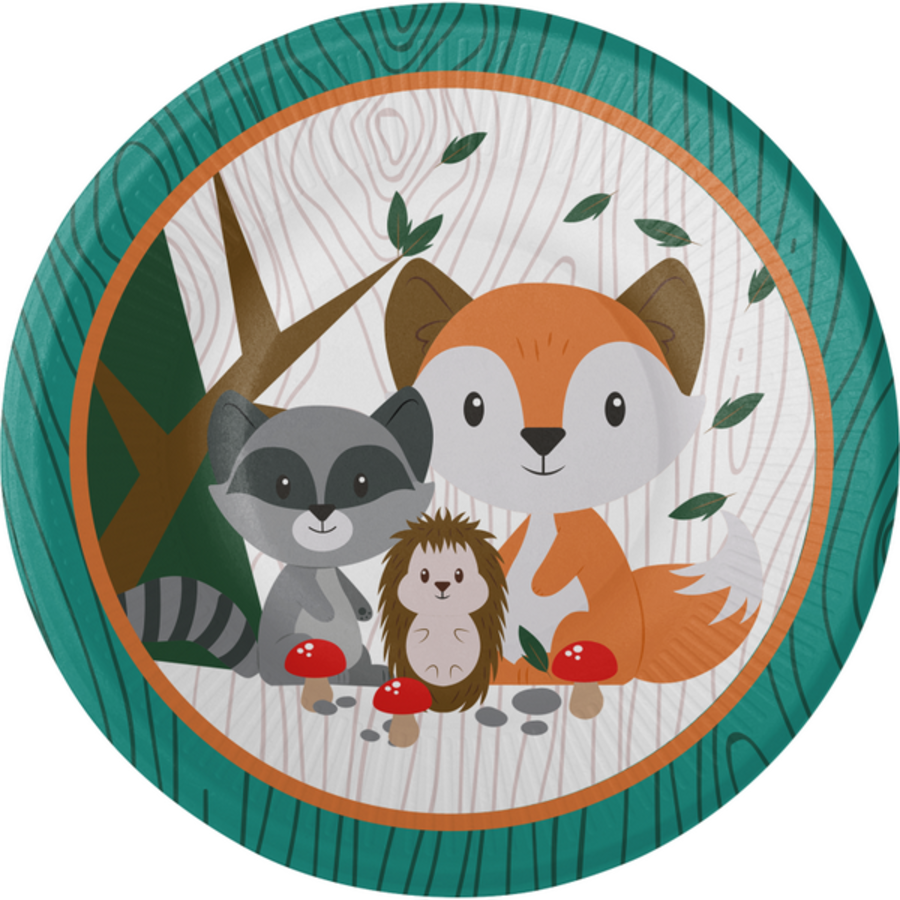 Een pakje met 8 kartonnen bordjes bedrukt met bosdieren. Doorsnede: 23cm.