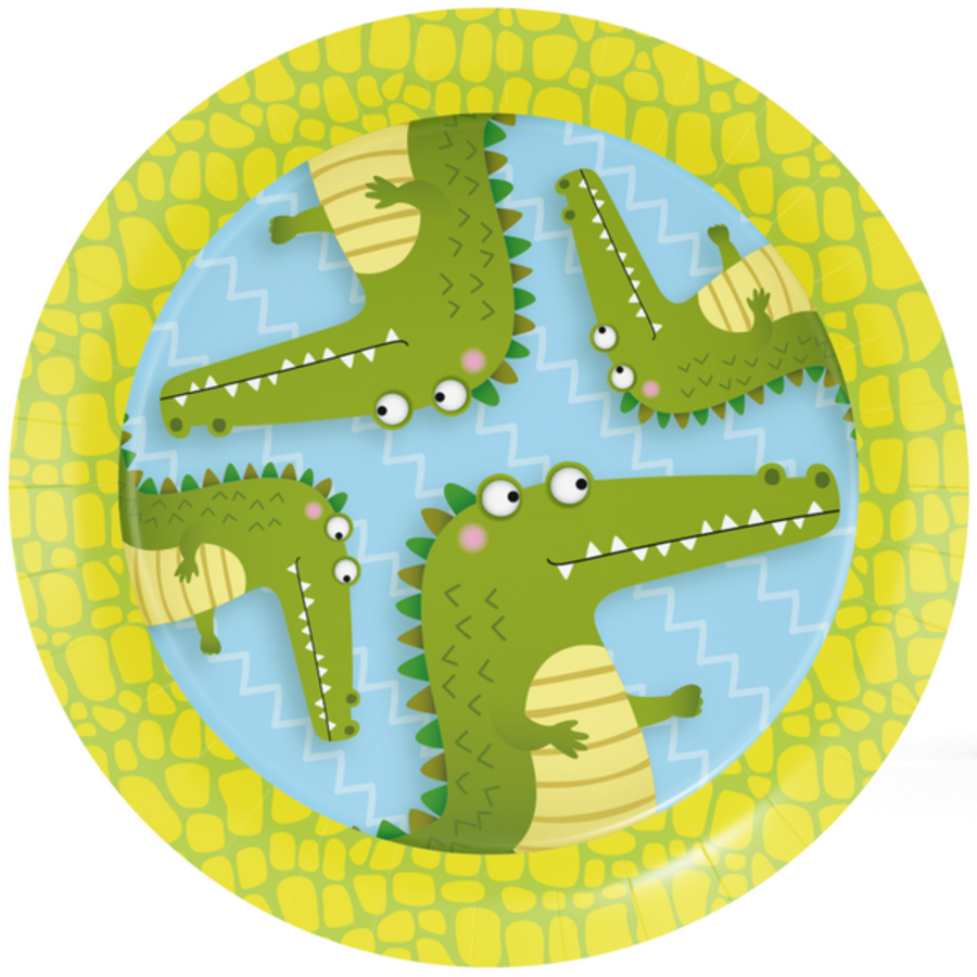 Een pakje met 8 kartonnen bordjes bedrukt met grappige krokodillen. Doorsnede: 23cm. Erg leuk voor een jungle of krokodillen party.