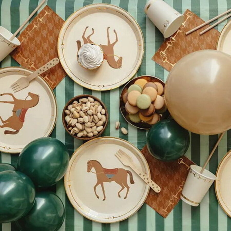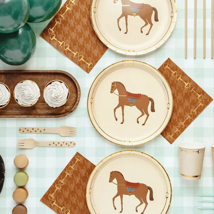Een pakje met 6 prachtige kartonnen bordjes bedrukt met een paard. Deze bordjes hebben een goudkleurig randje. Erg mooi. Perfect voor kinderverjaardag in het thema paarden. Doorsnede: 23cm.