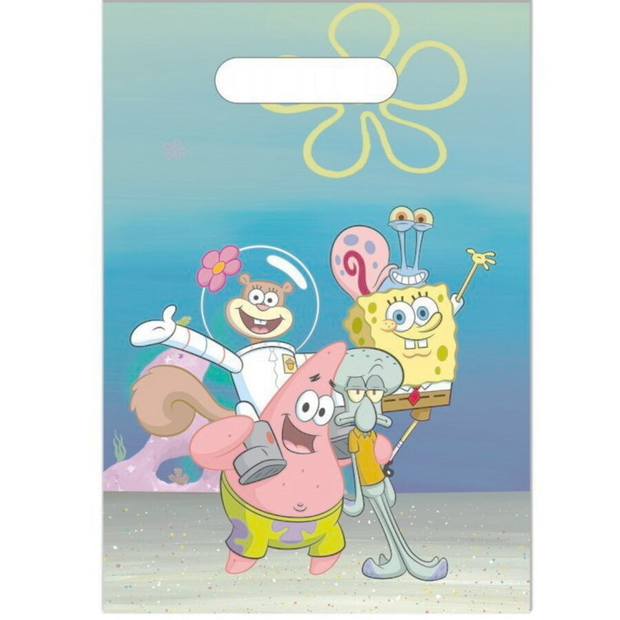 Een pakje met 6 plastic cadeau zakjes bedrukt met Spongebob en zijn vrienden. Afmeting: 16cm x 25cm.