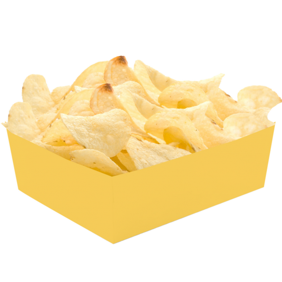 Twaalf kartonnen chipsbakjes in de kleur geel. Afmeting: 15cm x 11cm x 6cm. Perfect chips, popcorn of andere snacks.