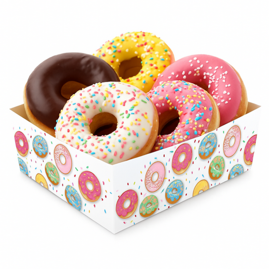 Een pak met 12 witte snackbakjes bedrukt met donuts. Afmeting: 15cm x 11cm x 6cm. Perfect chips, popcorn, natuurlijk donuts of andere mini snacks.