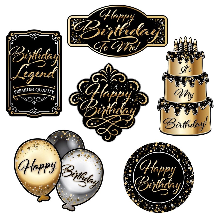 Een prachtige set met 6 verjaardag decoraties om aan de wand te hangen. Dubbelzijdig bedrukt in goud-zwart.