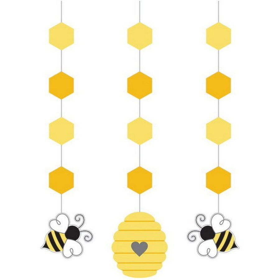 Een pak met 3 hangdecoraties met bijen en een bijenkorf. Leuke versiering om uw themafeest op te vrolijken. Natuurlijk ook gewoon leuk voor kinderen die gek zijn op bijtjes. Lengte: 57.1cm. Afmeting decoraties: 2 x 7.62cm en 1 x 17.7cm.
