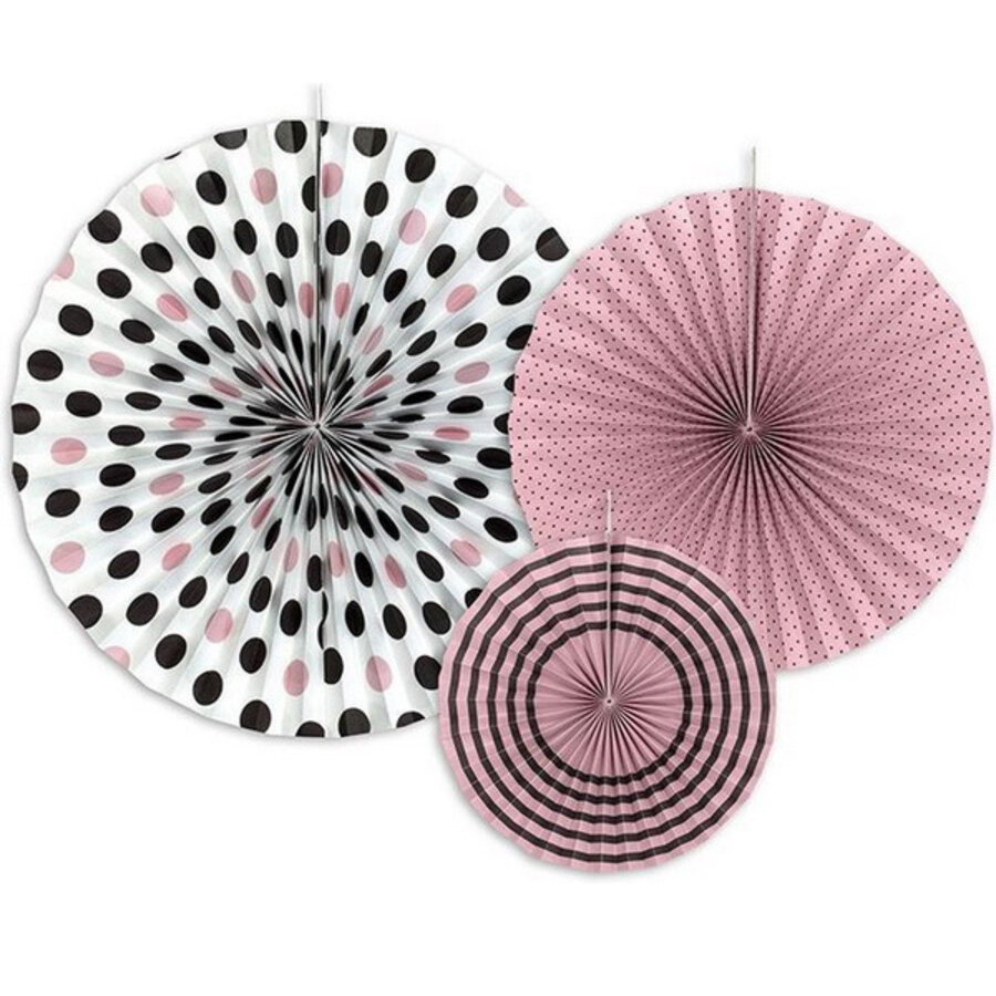 Een prachtige set met 3 roze honeycomb waaiers van verschillende afmetingen bedrukt met stippen en strepen. Super hip! Deze versiering zal uw zaal of huiskamer een extra leuke uitstraling geven. Afmetingen: 1 x 23cm, 1 x 32cm en 1 x 40cm.