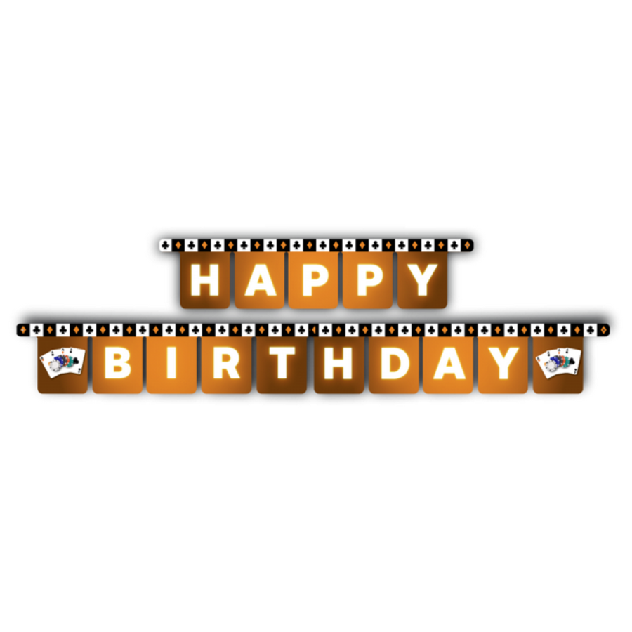 Een kartonnen slinger bedrukt met kaartsymbolen en de tekst happy birthday.