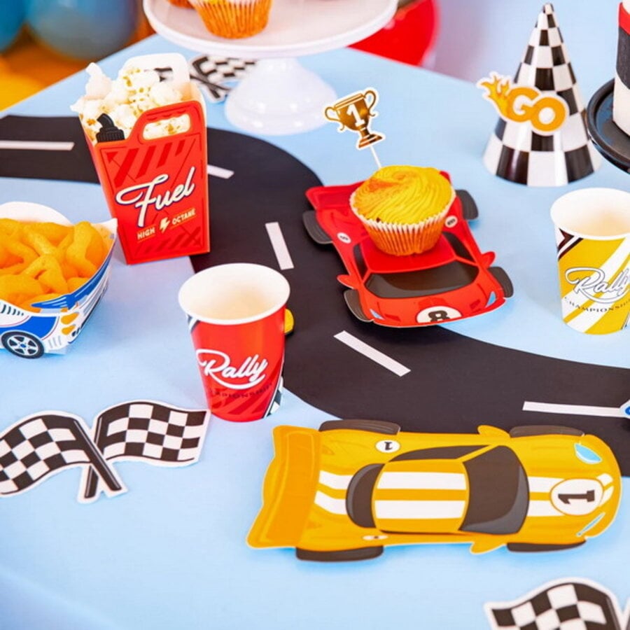 Een pakje met 6 kartonnen bordjes in de vorm van een raceauto. Afmeting: 23cm x 13cm.