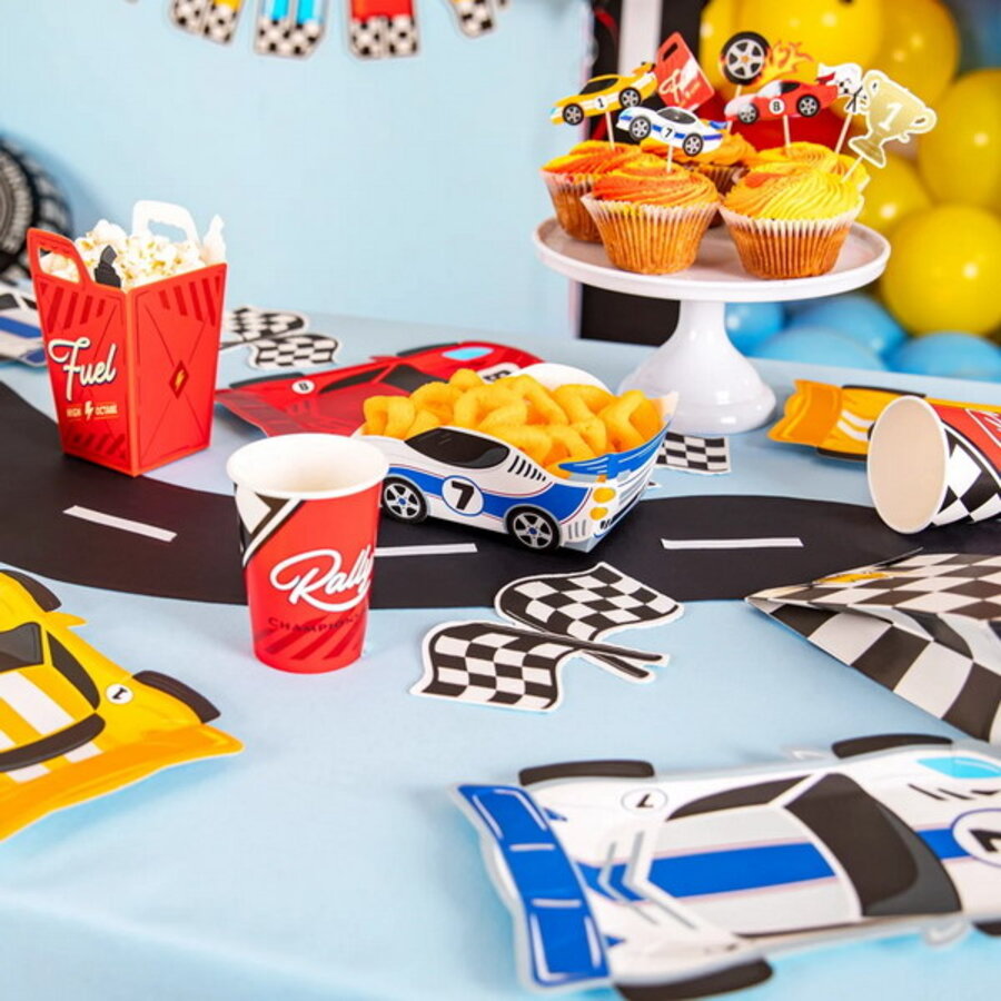Een pakje met 6 kartonnen bordjes in de vorm van een raceauto. Afmeting: 23cm x 13cm.