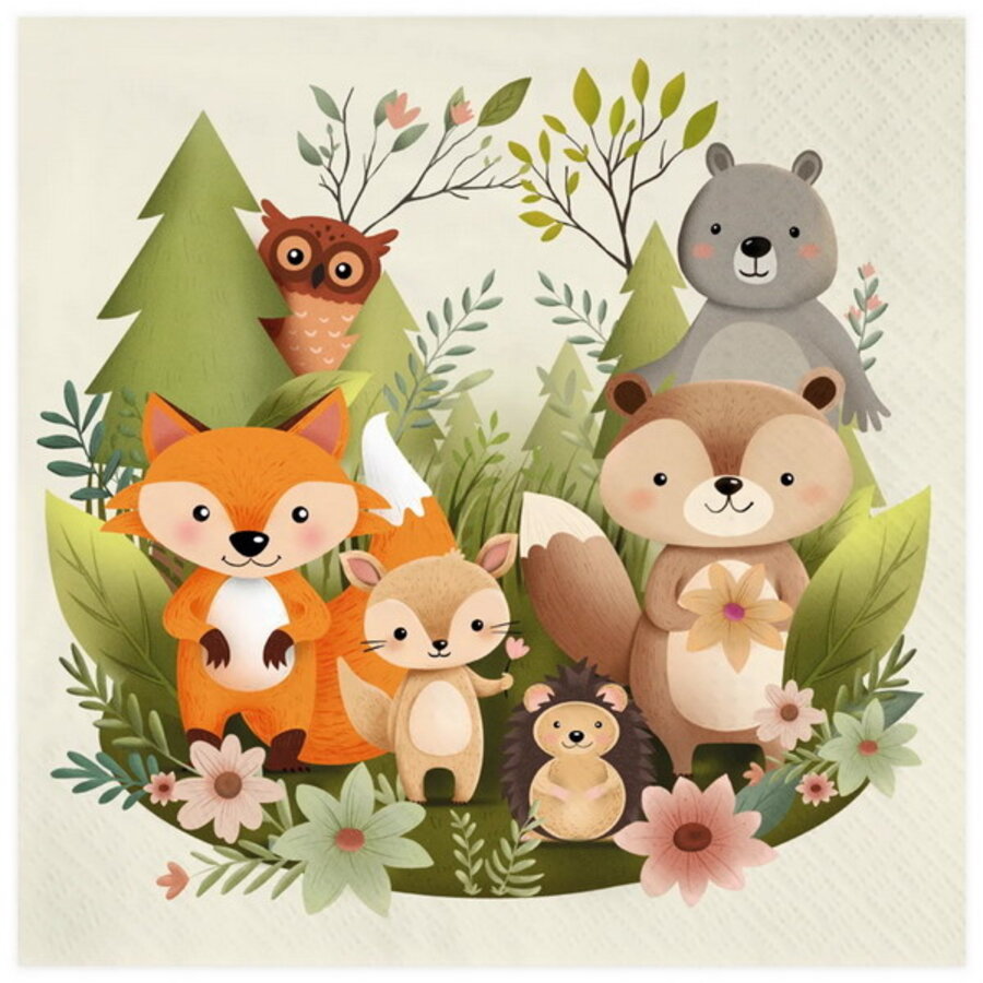 Een pakje met 10 servetten bedrukt met bosdieren. Afmeting: 33cm x 33cm.