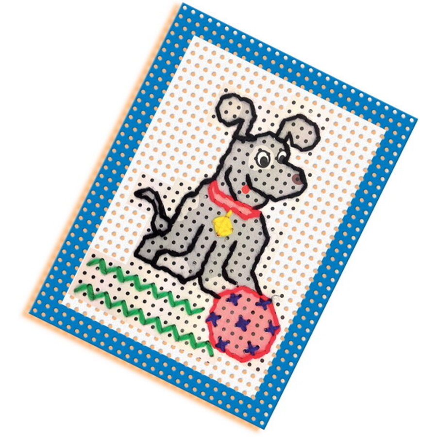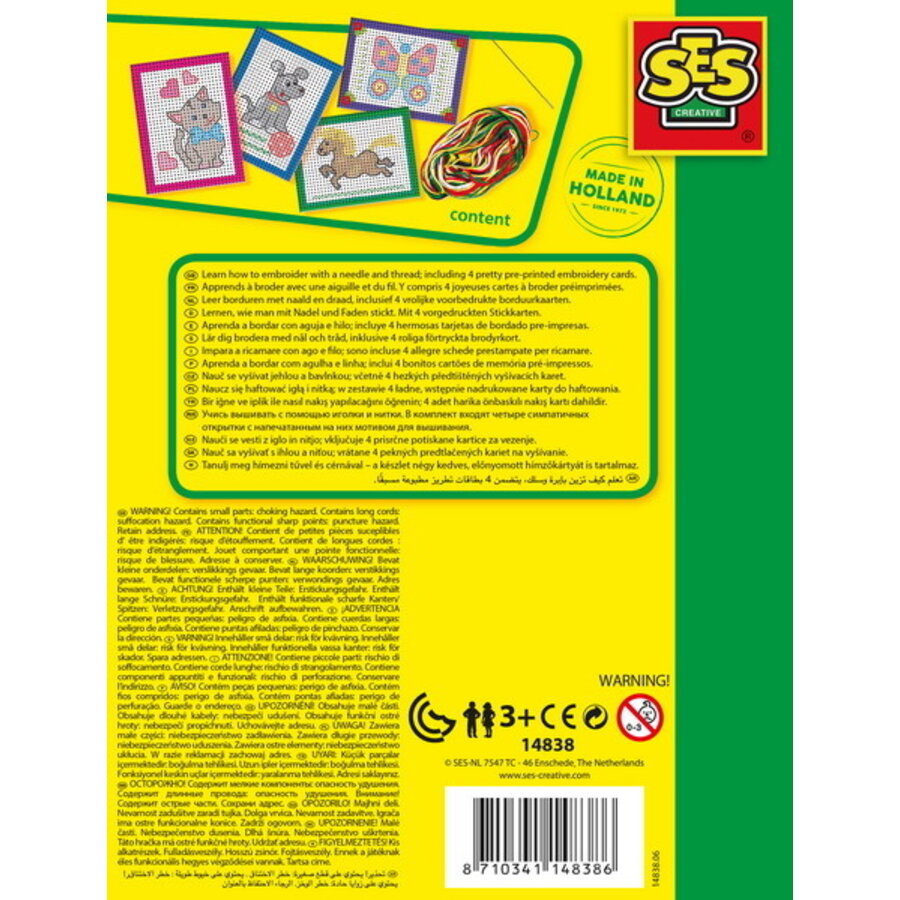 Type product: Knutselset voor kinderen, Aanbevolen leeftijd (min): 3 jaar, Inclusief onderdelen voor kunst & knutselen: Naainaald, Sjabloon, Garen, Kleur van het product: Meerkleurig. Aantal stuks: 4 stuk(s), Verpakkingsinhoud: 4 voorbedrukte borduurkaarten (geperforeerd); Naald; Vingerhoedje; Garen: zwart, rood, blauw,.... Type verpakking: Doos