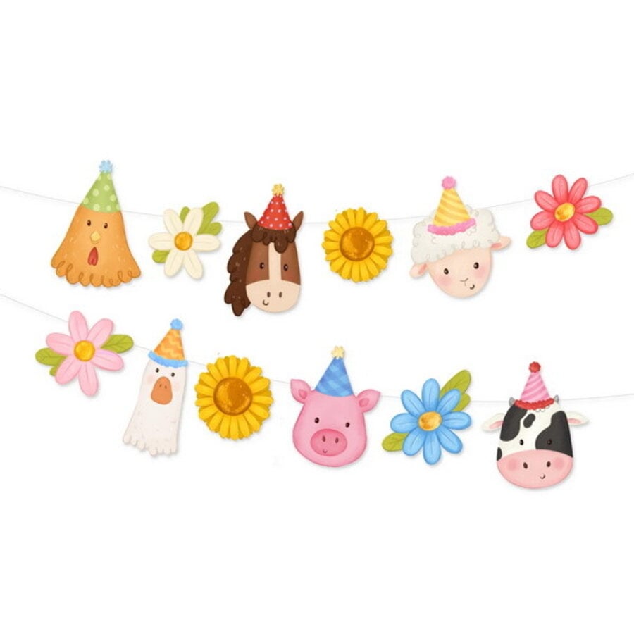 Een slinger met boerderij dieren en bloemetjes. Zes dieren en zes bloemetjes. Lengte slinger: 190cm x 24cm. Inclusief 5 meer draad.