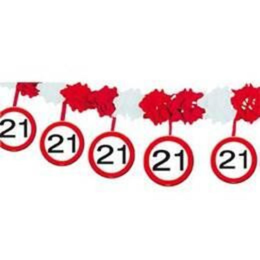 Een slinger met hangende verkeersborden met het getal 21. Versier de woonkamer met deze verkeersbord slinger, de slinger is van papier dus niet geschikt om buiten te hangen. Wil je wel slingers buiten, dan is dit afzetlint of deze vlaggenlijn een leuk alternatief. Alles in het wit-rode verkeersbord thema.
