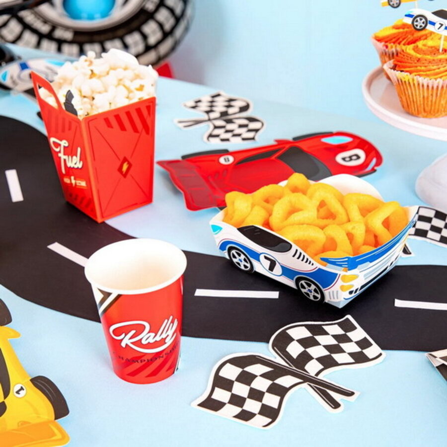 Een pakje met 3 kartonnen snackbakjes in de vorm van een raceauto. Afmeting: 16cm x 11cm x 6.5cm. Super cool voor een kinderverjaardag in het thema racen of Formule 1.