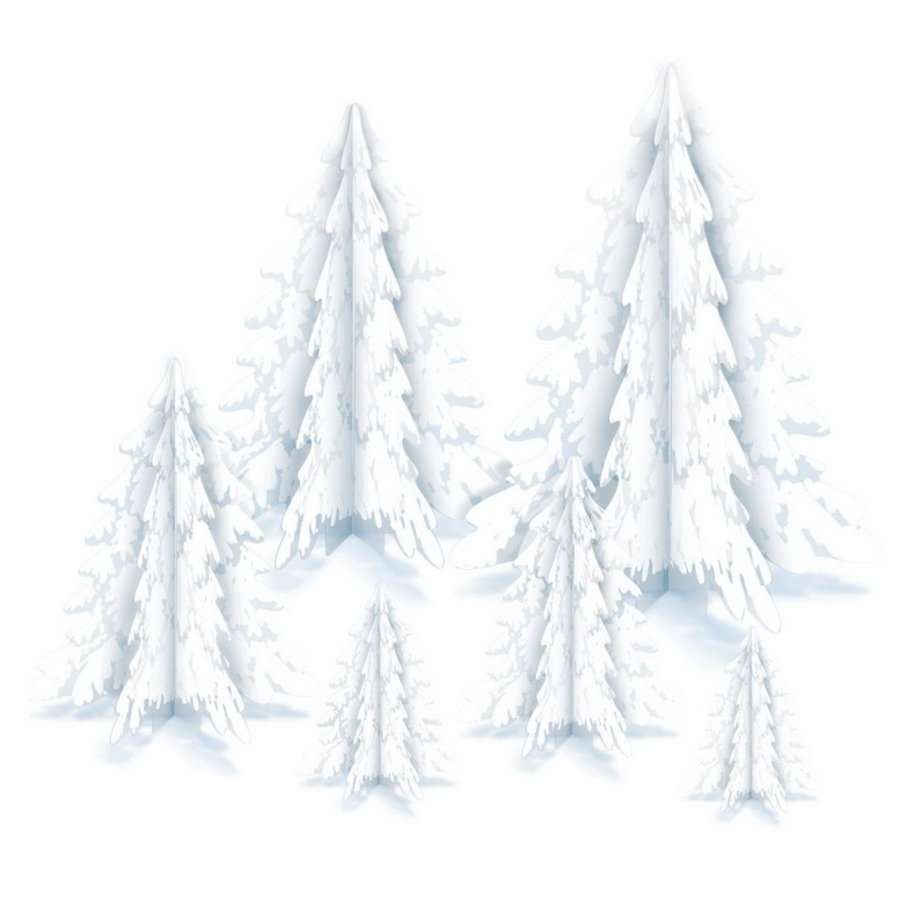 Zes prachtige luxe tafeldecoraties van besneeuwde bomen. Deze zijn van plastic, dus u kunt ze elk jaar opnieuw gebruiken. Schitterend voor op tafel bij elk winter themafeest. Afmetingen: 10cm tot 32cm.