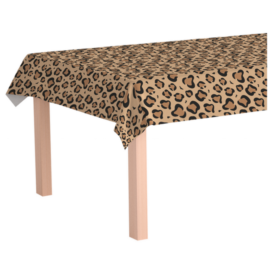Een plastic groot tafelkleed bedrukt met een luipaard print. Afmeting: 137 x 274cm. Perfect voor jungle feesten.