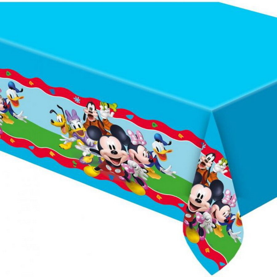 Een tafelkleed bedrukt met Mickey Mouse en andere Disney figuren. Afmeting: 120 x 180cm.