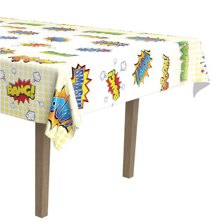 Een groot plastic tafelkleed bedrukt met superhelden kreten zoals POW en BANG! Leuk origineel thema voor kinderen. Afmeting: 137 x 274cm.