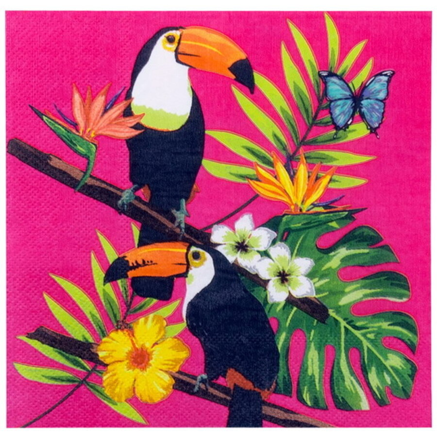 Een pak met 20 servetten bedrukt met een Toekan en tropische bloemen. Afmeting: 33 x 33cm.