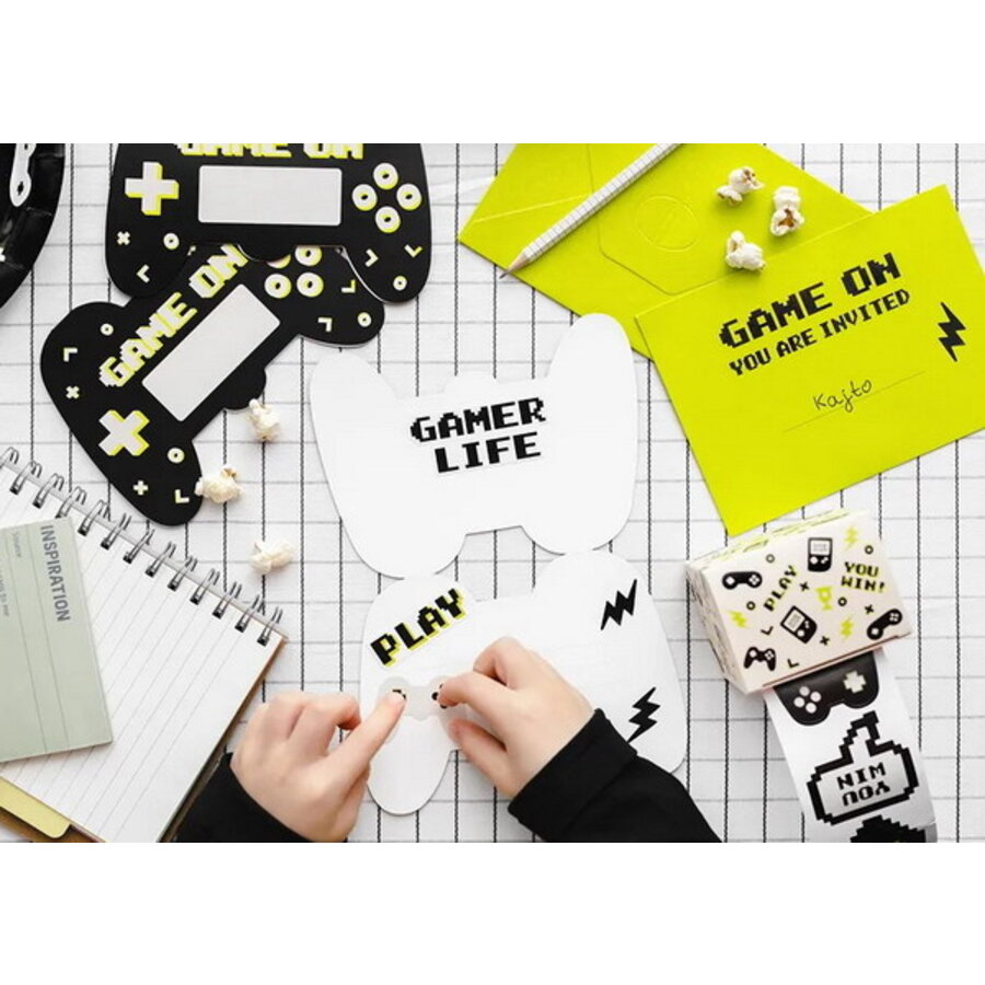 Een pakje met 6 uitnodigingskaartjes in de vorm van een gamepad. Afmeting: 16cm x 11.5cm. Inclusief 6 enveloppen.