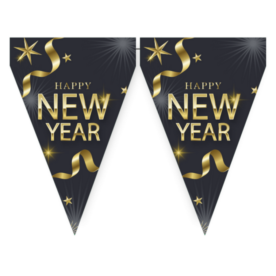 Een stijlvolle dubbelzijdig bedrukte papieren vlaggenlijn met de tekst Happy new year. Mooie versiering voor een oud en nieuw party. Lengte: 3 meter.