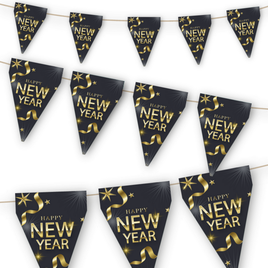 Een stijlvolle dubbelzijdig bedrukte papieren vlaggenlijn met de tekst Happy new year.