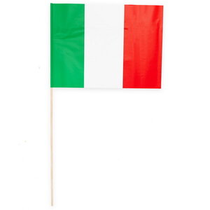 Een pak met 10 papieren zwaaivlaggetjes in de bekende Italiaanse keuren groen, wit en rood. Het stokje is van hout. Afmeting totaal: 50cm x 29. Afmeting vlaggetje: 27.5cm x 20cm.